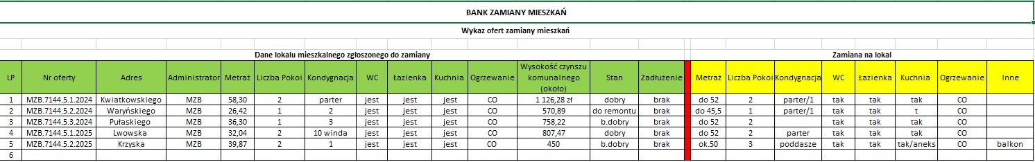 Mieszkańcy mają możliwość zapoznania się z ofertami zamiany mieszkań, które udostępniane są w siedzibie MZB ul. Waryńskiego 9. Każda osoba może śledzić Rejestr samodzielnie, natomiast szczegółowych informacji takich jak: forma kontaktu, a także wysokość zadłużenia, udziela pracownik MZB po osobistym stawiennictwie.